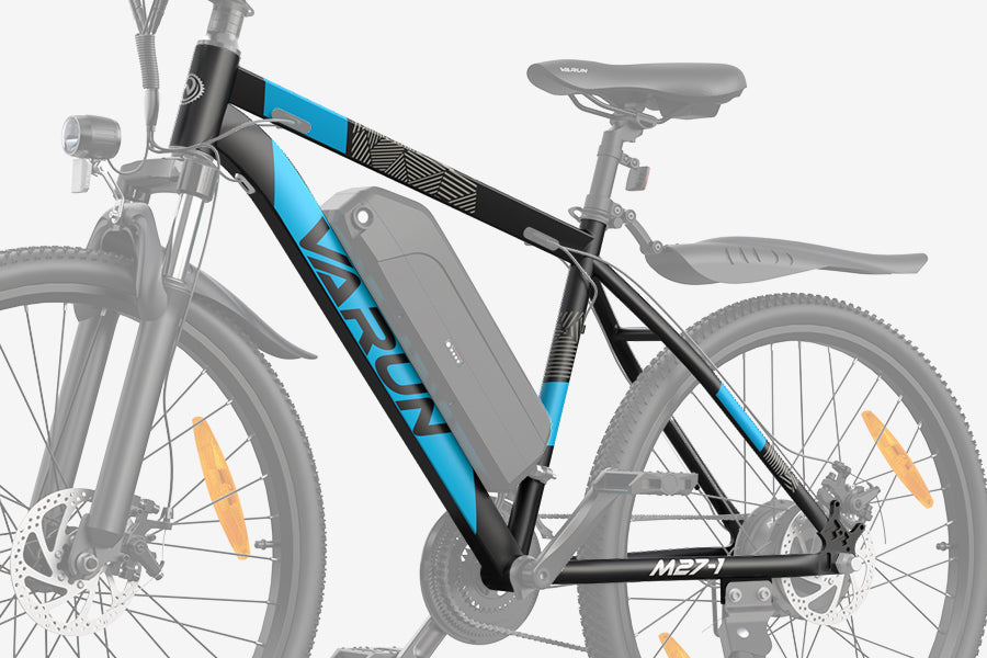 Varun E-Bikes verfügen über einen herausnehmbaren Akku, den Sie herausnehmen und zu Hause aufladen können, oder Sie können ihn direkt am Fahrrad aufladen.