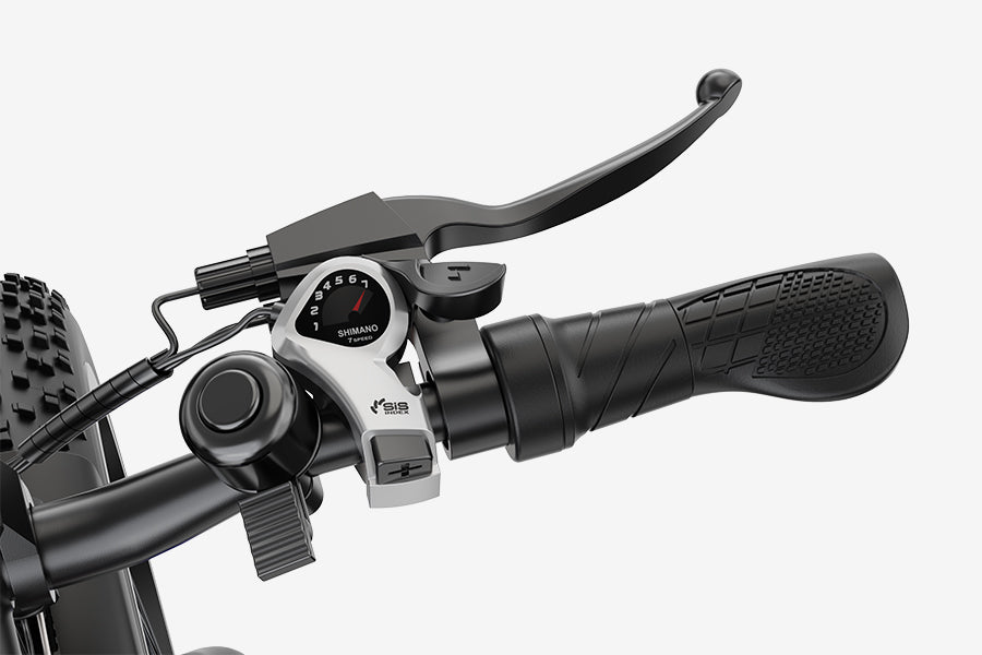 The Shimano 7-speed gear shifter, combined with a multi-function thumb lever, allows riders to seamlessly adapt to varying speeds and terrains. This intuitive control enables effortless gear changes and quick switching between the three pedal assist levels for optimal performance in all conditions.